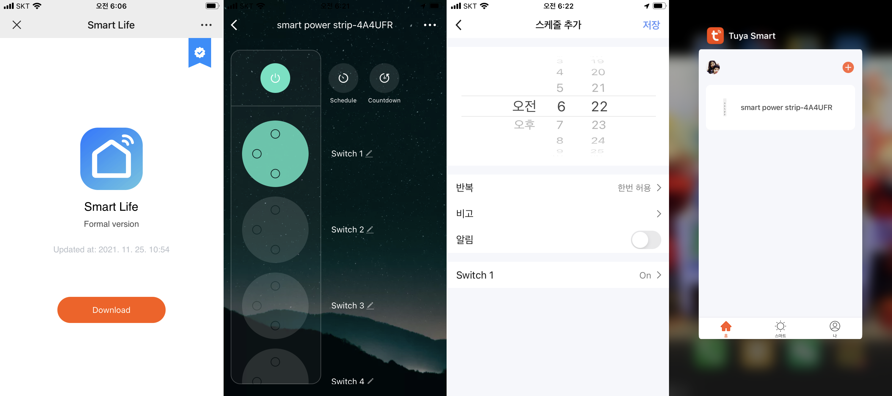 스마트폰으로 ON / OFF 가능한 스마트콘센트 입니다. 2400W를 지원하고 모든 콘센트 암 / 수 한국형입니다. 거기에 USB 4 포트 최대 2.4A를 지원하기 때문에 깔끔한 구성이 가능합니다. 앱은 Smart life와 TUYA 지원을 합니다. TUYA를 권해 드립니다.